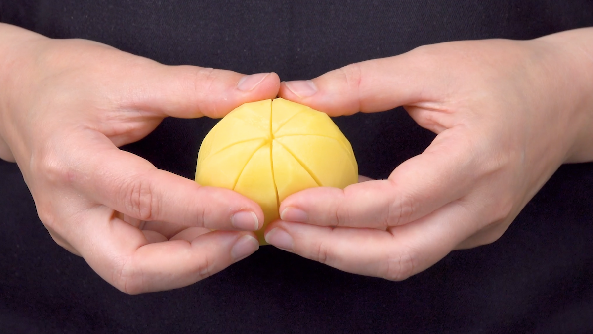- Schäle die Kartoffeln und halbiere sie der Breite nach. Lege die Hälften dann auf die Schnittkante und schneide sie oben so ein, dass 8 kuchenstückförmige Abschnitte entstehen. Wichtig ist, dass die Hälften nicht komplett durchgeschnitten werden.