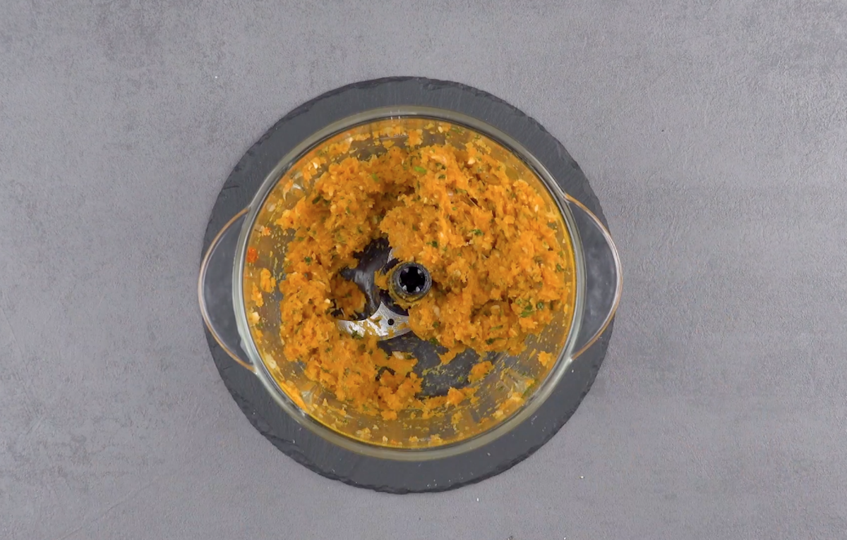 - Schneide die Hähnchenbrust, Zwiebeln, Knoblauch und Petersilie grob klein und gib alles in einen Mixer. Füge dann Paprikapulver, Currypulver und Pfeffer hinzu und püriere alles fein.