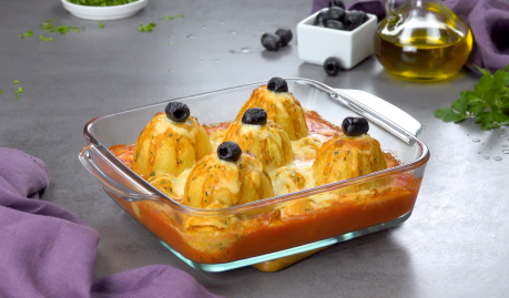 - Gib die Tomatensoße in eine Auflaufform. Stelle nun die gefüllten, frittierten Kartoffeln hochkant in die Tomatensoße. Die Bällchen legst du ebenfalls in die Form und bestreust alles mit Käse. Lege auf jede Kartoffelspitze eine schwarze Olive. Schiebe die Auflaufform bei 175 °C Umluft für 25 Minuten in den Ofen.
