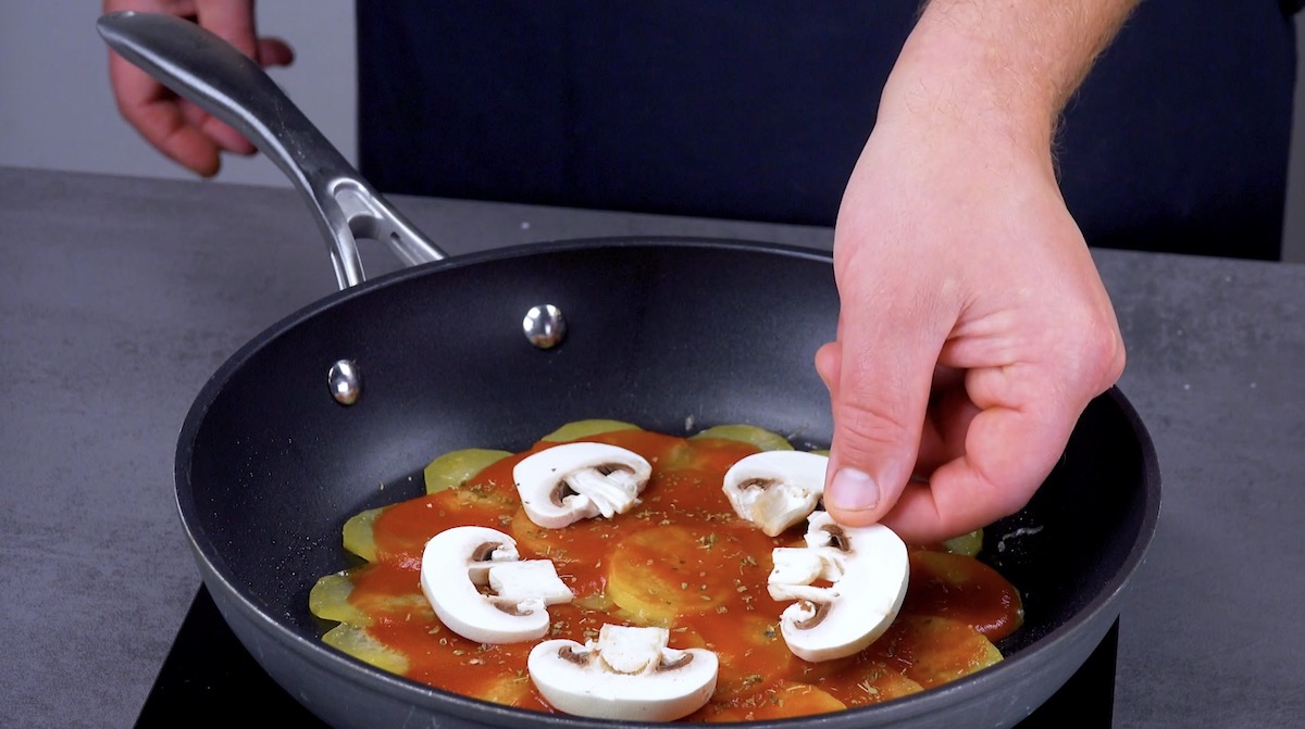 - Schneide den Champignon in dünne Scheiben und lege diese auf die Tomatensoße.