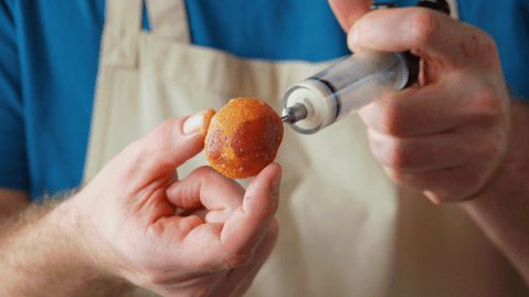 Nun geht’s ans Befüllen: Fülle dazu weiße Schokocreme und Himbeermarmelade jeweils in eine Marinade-Spritze 🛒 oder in einen Spritzbeutel und befülle die Knusperbälle damit. Danach kannst du dich direkt ins knusprig-cremige Vergnügen stürzen – lass es dir schmecken!