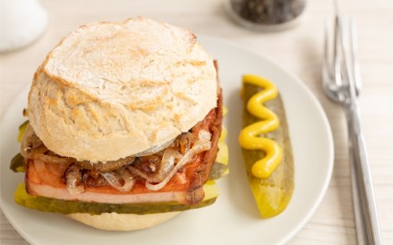 Das Besondere an diesem Leberkäse-Burger ist das Zusammenspiel der kräftigen Gewürze des Leberkäses mit den süßen Zwiebeln und den sauer eingelegten Gurken. Jeder Biss sorgt für zufriedene Gesichter am Tisch.