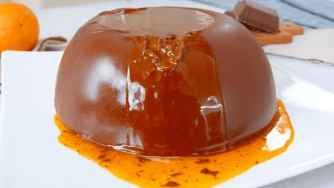 - Gieße direkt vor dem Servieren die heiße Orangensoße in die Mulde, sodass die Schokolade zu schmelzen beginnt.