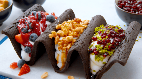 8. Fülle die Oreo-Creme in die Oreo-Welle und garniere sie nach Belieben mit frischen Früchten, Nüssen, Bonbons und Saucen.