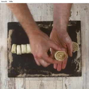 - Jetzt rollst du den Teig am kürzeren Ende auf und schneidest ihn in gleichgroße Stücken.