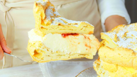 Die Zubereitung klingt zunächst anspruchsvoll, ist aber gut machbar. Brandteig braucht vor allem eines: Aufmerksamkeit. Du kochst Wasser mit Butter auf, rührst dann das Mehl ein und beobachtest, wie aus einer matschigen Masse ein glatter Kloß wird. Danach abkühlen lassen, Eier einzeln unterrühren, backen – und dann kommt das kleine Wunder: Der Teig bläht sich auf, wölbt sich unregelmäßig und bildet genau diese unnachahmlichen Hügel und Täler, die dem Karpatka seinen Namen geben. Um das zu erzielen, ist es wichtig, dass du den Ofen während der Backzeit nicht öffnest. Tust du dies, kann er in sich zusammenfallen.