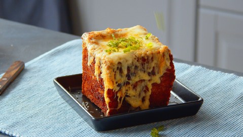 Zwiebelsuppe gehört ganz klar zu den bekanntesten Klassikern der französischen Küche. Aber so wie in unserem Rezept hast du die Suppe garantiert noch nicht gegessen. Wir verpassen ihr ein eindrucksvolles Upgrade, füllen sie in einen Würfel aus frittiertem Weißbrot und überbacken das Ganze abschließend noch mit Käse. Mehr geht wirklich nicht. Aber überzeug dich am besten selbst.